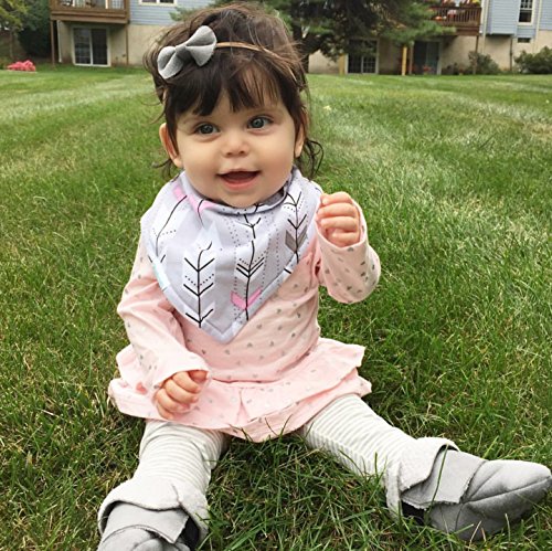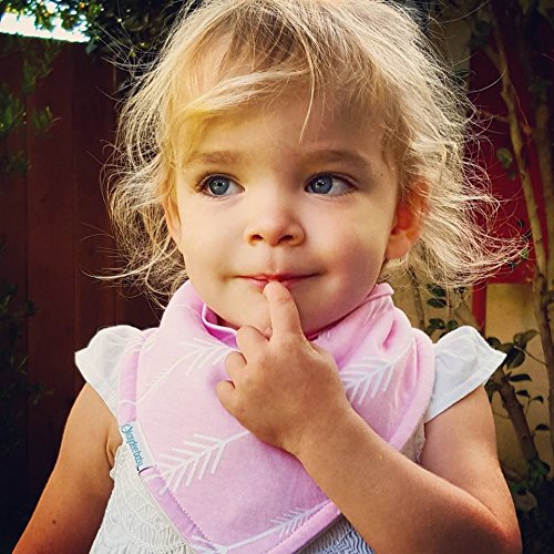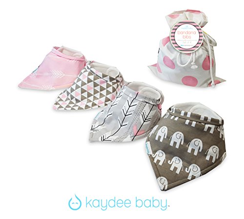 - Feature : SUPERIOR BABY BANDANA DROOL BIBS - Made with 100% Soft Cotton with an Ultra Absorbent Back Polyester Fleece Back Keeps Dribble and Drool Off of Baby, Infant, Toddler Clothes. Gentle to the touch helps keep babies tender skin dry and rash free. Great alternative and much more comfortable than plastic bibs or waterproof material. Very handy to use as a burp rag or burpy bib and easy to store in diaper bags or stroller compartments. / FREE GIFT BAG INCLUDED - Kaydee Baby Bibs are Super Fun and Hip! Your Baby will Dress in Style with our Unique Designs. Our Set of 4 and includes White Elephants, White Arrows on Pink, Pink and Grey Triangles and Grey and Pink Arrows. These are the perfect accessory to any baby outfit with the added bonus of protecting their clothes / EASY SNAPS ENSURE BIB STAYS ON - Kaydee Baby Bibs come with 2 Nickle-Free Adjustable Snaps For Growing Babies between 3 and 24 Months. They Stay on Even While Baby is Playing Freely. These are a great alternative to velcro straps which are easy to pull off and ruin clothes in the wash. Washing machine safe. Keeps shape after wash! / BACKED BY THE KAYDEE BABY PRODUCTS GUARANTEE - We guarantee you will love the our bandana drool bibs, and if you aren't absolutely satisfied, return it within 30 days for a full refund, no questions asked. / UNIQUE GIFT - Kaydee Baby Bibs make for a Unique and Fun Gift! A Must Have for Baby Showers, Birthdays, Christmas and Any Occasion! Perfect Gift Basket Set! Mothers everywhere are raving about Kaydee Baby Bandana bibs. Fun, affordable, adorable and serve their purpose well.