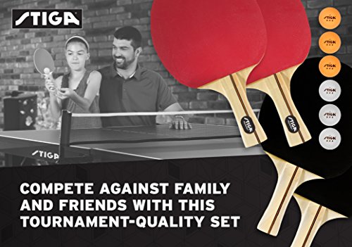 Startadoublesmatchwiththisfour-playertabletennissetfromStiga.Thesetcomeswithfourtabletennisrackets(twowithblackrubber、twowithredrubber)featuringa1-millimetersponge、A5-plyblade、andaconcavehandle.Thepipsareinvertedforincreasedballcontrolandaddedspin.Theracketsaredesignedtoprovidejusttherightamountofgive、allowingforsuperiorspinsandserves.Alsoincludedinthissetaresix40-millimeterballs(threeorange、threewhite).Theballshaveathree-starrating、whichmeansthey'resuitableforprofessionalcompetition.Thesetiscoveredbya90-daywarrantyonmanufacturerdefects