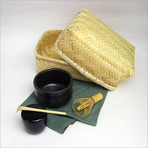 -. Feature : サイズ:竹かご 高8cm×幅21cm×奥14cm、茶器径9cm、茶器高6.5cm / 重量:420g / 材質:美濃焼陶器・竹・ユリア樹脂・綿布 / セット内容:茶器(黒天目碗)・茶せん・棗(ナツメ)・竹茶さじ・敷き布・布巾