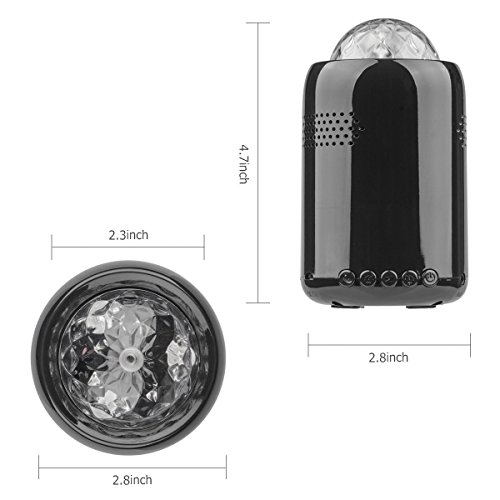 -. Feature : CARRY THE PARRT IN YOUR POCKET - Portable mini design,perfect for family small party ,family vacation,a perfect gift for your chilren / COLORED LED LIGHT SHOW - Projects pulsating multi-colored party lights onto walls and ceilings / BLUETOOTH CONNECTIVITY WITH HANDSFREE CALLING- Quick and simple connect to iPad, iPod,smartphones, tablets, computers and more.Full bluetooth wireless control change tracks,adjust volume and pause music,handsfree calling etc / CRISP, CLEAR SOUND - Sounds great with bright flashing multi-colored LED light show for an instant disco dance party anywhere you go!Can be used with or without the light show / RECHARGEABLE BUILT-IN BATTERY - Easily recharge plugs into any USB power source with included cable(only take about 2 hours to fully charge)