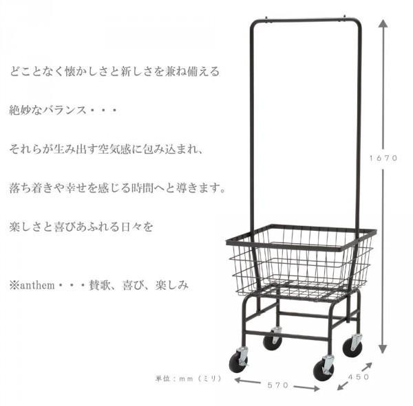 ビンテージ風のおしゃれなハンガーラック。キャスター付きです。 製造国:台湾 素材・材質:スチール紛体塗装 商品サイズ:W570×D450×H1670mm(バスケットサイズ:W670×D500×H310mm) 重量:6400g 仕様:組立品梱包:2個口耐荷重:バスケット4kg、フレーム3kg 付属品:六角レンチ・取扱説明書 ※サプライヤー直送品 ご注文後2~3営業日後の出荷となります【商品名】anthem(アンセム) Cart Hanger ANH-2738BK