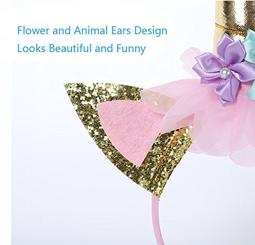 -. Title : Dmaxia Gold Unicorn Flower Animal Ears Headband & One Crown Highchair Banner Burlap For Baby First Birthday Party Photo Props Decoration Set