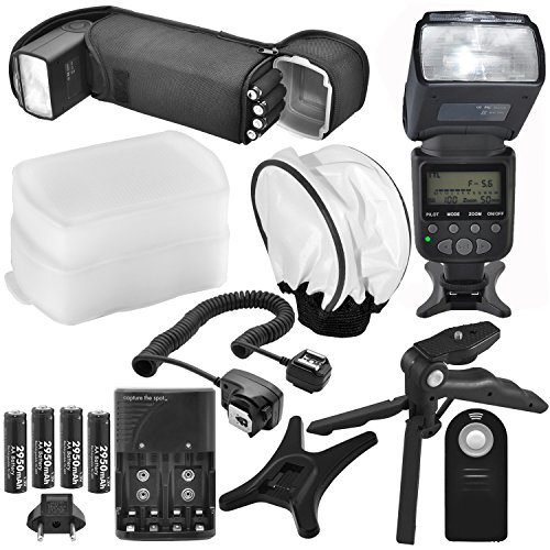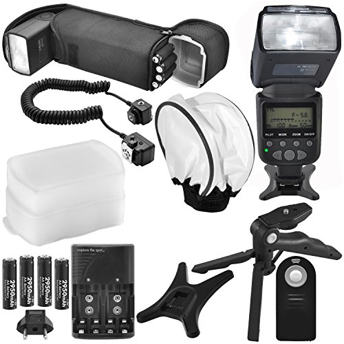 Accessory bundle includes an AA battery with compatible charger, 3 Ft. off-camera flash cord, universal remote, hand grip handheld tripod, universal diffuser, and flash pouch