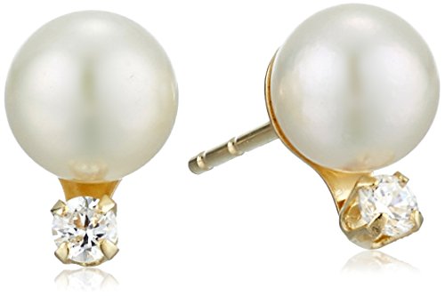 Stud earrings in 14k yellow gold featuring cubic zirconia rounds resting beneath smooth round pearls