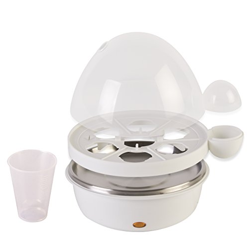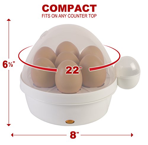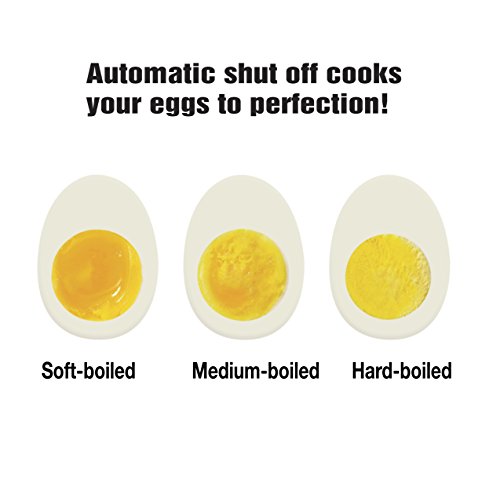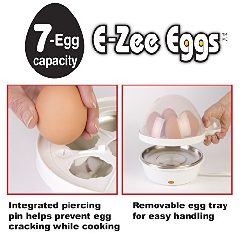 AUTOMATIC COMPACT KITCHEN APPLIANCE is so easy to use and cooks 1 to 7 PERFECT EGGS at a time. Use the measuring cup to to add just the right amount of water to control cooking time for Soft, Medium or Hard-boiled eggs. The integrated piercing pin helps prevent eggs from cracking during cooking. Unlike conventional egg cooking methods, NO NEED to worry about under or over cooking, or forgetting the pot on the stove! Simply place your eggs on the cooking tray, add water and plug it in. When eggs are ready, the built-in thermostat switches off the boiler and the buzzer sounds. The E-Zee Eggs electric egg cooker takes the guesswork out of cooking perfect eggs every time! UL Certified Appliance - 5 foot electric cordFeature