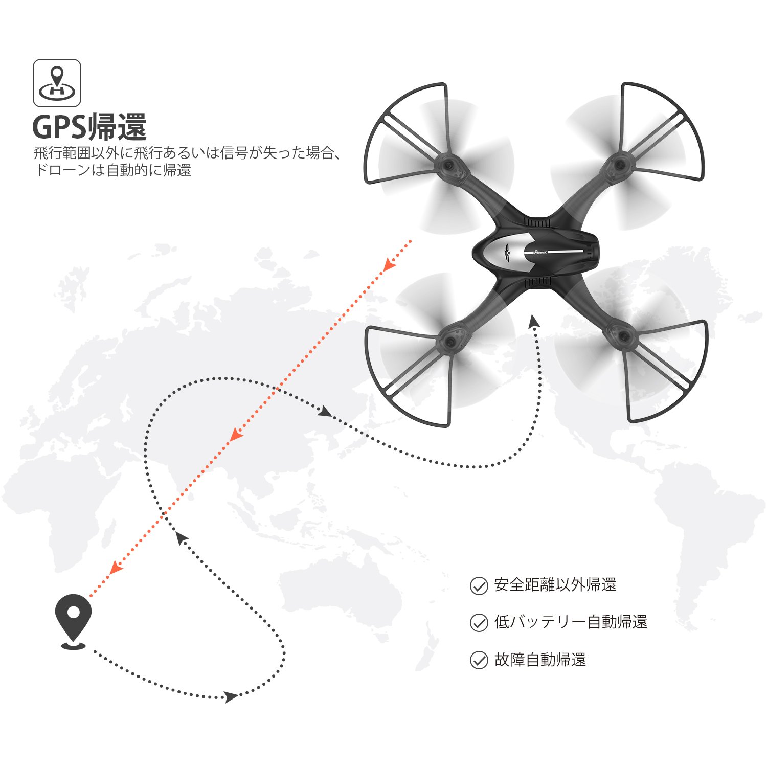 「オートリターンモード」オートリターンモードあるので、機体は自動的に帰還できます。バッテリーの残量が不足、安全距離外、故障する時、帰還機能は自動的に起動されます。大切のドローンを紛失から守ります。そして、GPS機能が搭載で、地図に最後の着陸位置を示すことができ、ドローンが紛失しても、すぐ見つかります