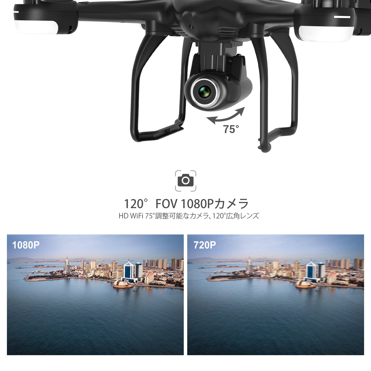 「1080P高品質カメラ」1080P 120°広角HDカメラ付き 75°撮影角度が調整できHDカメラが搭載。写真や録画は最大1080pの高解像で記録できます(SDカードが使用する時のみ)。 しかも、操作可能距離300M、生中継距離距離100~150Mで、スマホでのリアタイム伝送(720P)は臨場感満々の映像を楽しむことができます