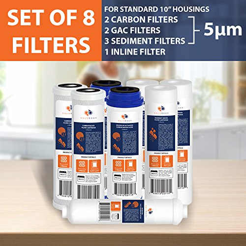 -. Feature : FITS STANDARD 10 INCH. HOUSINGS / 2 OF CARBON BLOCK CTO WATER FILTER CARTRIDGES - 5 Micron 100% Premium Quality Coconut Shell Activated Carbon Block CTO Standard Size Filter Cartridge / 3 OF SEDIMENT PP WATER FILTER CARTRIDGES - 5 Micron Gradient Density, Multi-Layered, Melt Blown Sediment Filter Cartridge / 2 OF GRANULAR ACTIVATED CARBON GAC WATER FILTER CARTRIDGES - 5 Micron 100% COCONUT SHELL Standard Size Filter Cartridge / 1 OF INLINE GAC FILTER/RO POST FILTER WITH 1/4" FNPT CONNECTION ON BOTH ENDS - COCONUT Shell Inline Granular Carbon Pre/Post Filter. Up to 2,000 Gallons of Filtration Life Capacity.