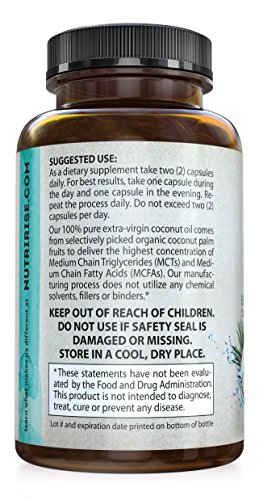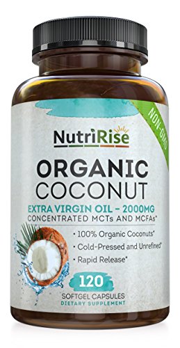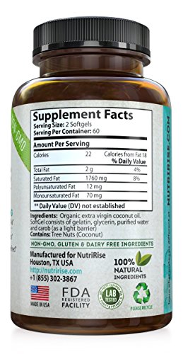 -. Binding : Health and Beauty -. Brand : NutriRise -. EAN : 0737212755465 -. Feature : 100% SATISFACTION GUARANTEED: Feel healthier or your money back - no questions asked! / ORGANIC COCONUT OIL: 100% Pure Non-GMO Certified Organic Extra Virgin Coconut Oil Capsules naturally derived from cold pressed coconut oil for enhanced potency and rapid release. / UNREFINED COCONUT OIL: NutriRise Organic Virgin Coconut Oil Softgels are a premium source of MCTs & MCFAs (higher than refined coconut oil or fractionated coconut oil) for cardiovascular support and optimal energy conversion. / SOLVENT FREE: NutriRise Pure Coconut Oil Supplement is FREE of binders, fillers, sorbitol, sweeteners, artificial ingredients, gluten, dairy, soy, corn, egg and magnesium stearate for increased bioavailability. Premium quality coconut oil for hair (coconut oil for skin) with superior anti-aging and beauty benefits! / DOCTOR-FORMULATED & MADE IN USA: To deliver maximum efficacy, every batch of NutriRise Organic Coconut Oil pills are doctor-formulated and third party tested for highest purity and quality assurance. Made in USA with compliance to cGMP standards. -. IsAdultProduct : 0 -. Label : NutriRise -. LegalDisclaimer : + These statements have not been evaluated by the Food and Drug Administration. This product is not intended to diagnose, treat, or cure any disease. -. Manufacturer : NutriRise -. MPN : LE -. PackageQuantity : 120 -. PartNumber : LE -. ProductGroup : Health and Beauty -. ProductTypeName : HEALTH_PERSONAL_CARE -. Publisher : NutriRise -. Studio : NutriRise -. Title : Organic Coconut Oil Capsules 2000 MG. 100% Pure Extra Virgin Coconut Oil. Natural Cold Pressed Coconut Oil From Non-GMO Coconuts. Unrefined Coconut Oil Rich in MCFA and MCT. 120 Softgels. Made in USA -. UPC : 737212755465