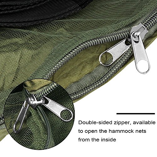 Hammock Mosquito Net:Mosquito net keeps the bugs out and lets you sleep in comfort.Our design allows the hammock to simply flip(don't need mosquito nets) or use mosquito nets.