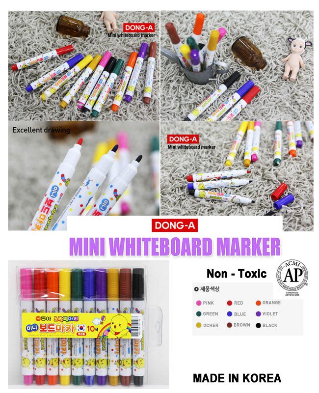 Dong-A Non-Toxic Cute Yellow Chick Mini White Board Marker - 10 Colors Sets Description |