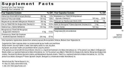 Studio : Thorne Research Publisher : Thorne Research Binding : Health and Beauty Product Description A comprehensive multi-mineral formula without copper and iron. Who should be taking a multiple mineral? Individuals at high risk for mineral deficiencies include the elderly due to deteriorating digestion, children and teenagers because of poor diet, individuals with eating disorders, and anyone suffering from a chronic disease. Taking certain prescription medications can also result in a mineral deficiency. Because the mineral content in fruits and vegetables depends on the soil the crop is grown in, even a healthy individual who maintains a good diet can be at risk for a mineral deficiency because of mineral-depleted soil. Since 1984, Thorne has set the standard for the exceptional formulation and quality manufacturing of nutritional supplements. Thorne delivers premium, science-based products, a health diagnostics technology platform, and the latest in medical education. With more than 350 products, Thorne is the most dispensed brand by 30-40 year old health-care practitioners. Thorne is dedicated to improving the health of our community as well as increasing the knowledge of nutritional health and wellness. Since 2012, Thorne has partnered with educational institutes and local charities to donate more than $1M in products and profits. Thorne products do not contain any unnecessary binders, coatings, disintegrants, fillers, or lubricants (including magnesium stearate) that could impair absorption. Thorne adheres to the FDA's current Good Manufacturing Practices (cGMPs) and has the highest number of NSF Certified for Sport products which tests for more than 200 banned substances for elite athletic competitions. 0