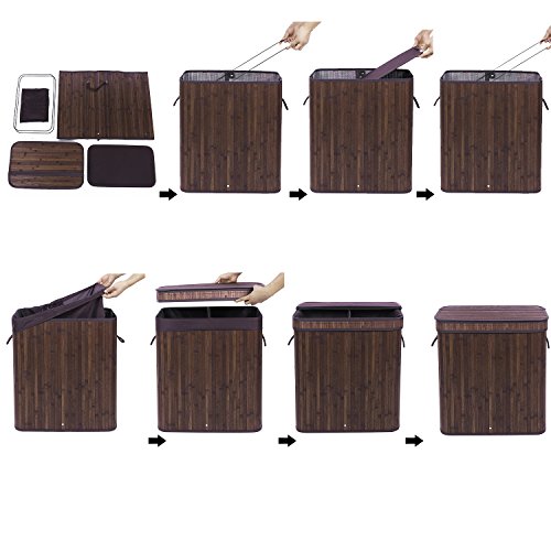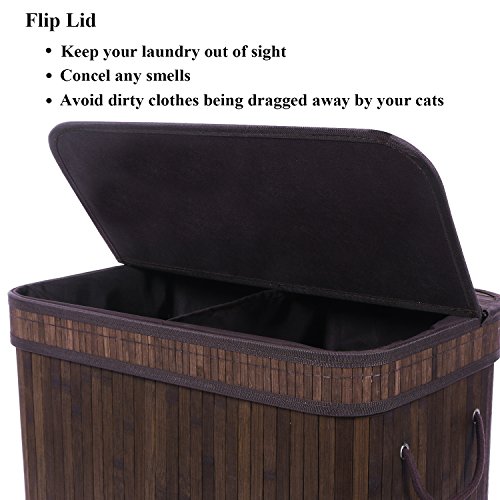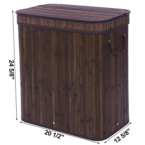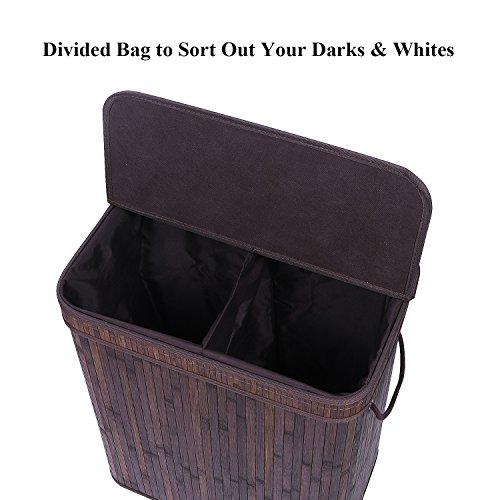 BEWISHOME Bamboo Double Clothes Hamper with modern and functional design could be an decent piece of furniture to any bedroom, laundry room, living room. Made of bamboo, it is durable as well as environmental friendly. Two-section liner is able to easily keep your clothes sorted, saving sorting after. Flip lid will keep your laundry out of sight as well as conceal the smell. Cotton rope handles are easy to transport to the washer or dryer. When not in use, foldable feature is very convenient for storage purposes or travel. Need extra storage? This could be an ideal storage bin, putting in your kids' room to store stuff like toys, clothes etc. Specifications: - Main Color: dark brown - Material: bamboo, MDF, non-woven fabrics, wire - Dimensions: 20.47"L x 12.60"W x 24.80"H (52 x 32 x 63cm) - Capacity: around 100L - Product Weight: 5.5lbs (2.5kg) - Package Weight: 7.1lbs (3.2kg) - Some minor assembly required Package Contents: - 1 x Laundry Hamper - 1 x Instruction 0 |