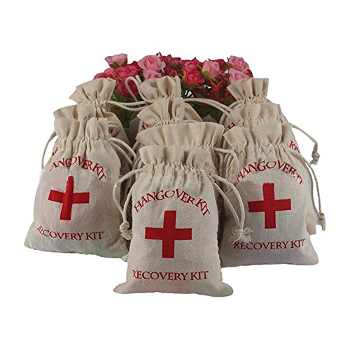 -. Feature : Set of 10,10*15cm(4 x 6inch), 100% Cotton / Perfect for Bachlor or Bachelorette Parties, Wedding Welcome Gift Bag, Birthday Celebration / Classic red cross + hangover kit + survival kit P.R.Inted on off-white cotton bag / Perfect for packaging DIY wedding favors e.g. Chocolates,sugared almonds,handmade soap,fresh coffee beans.etc. / It is so easy to open the bags,Double beam mouth design, better and convenient than most products in market.