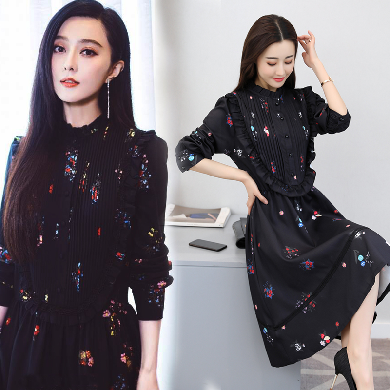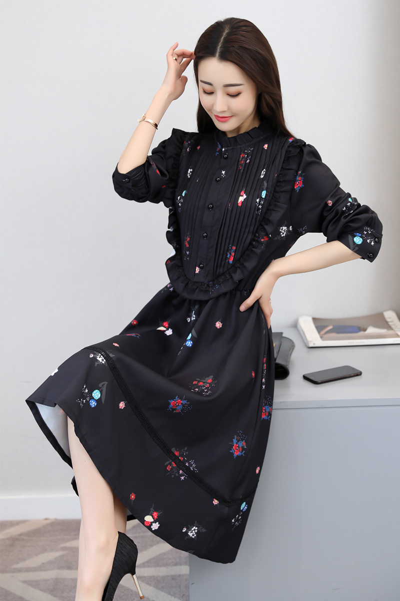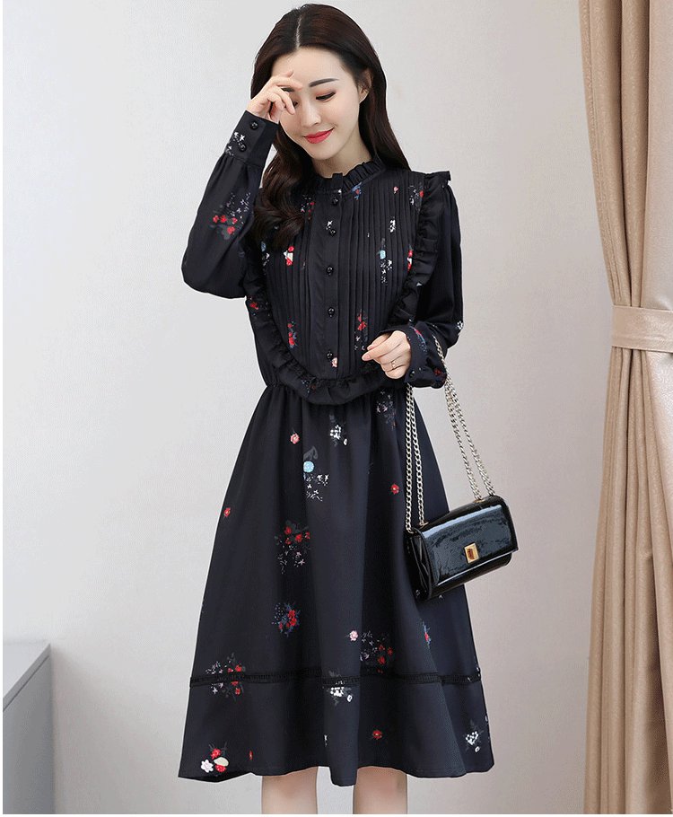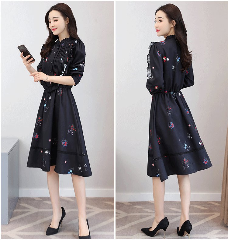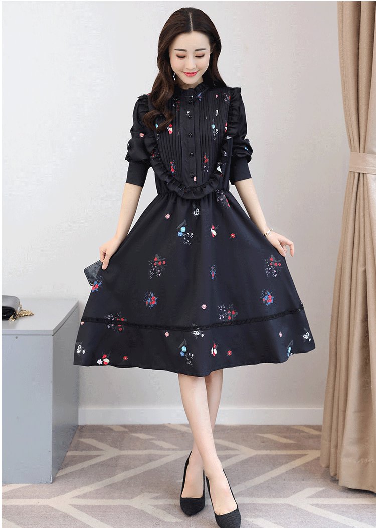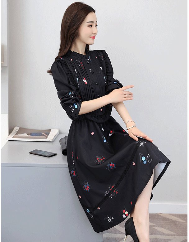 フェミニンなデザインのフレアワンピース。花柄にフリルの女性らしい可愛いスタイルです。