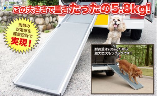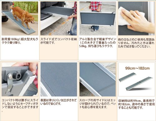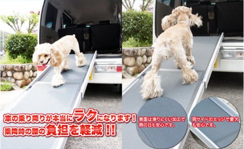 「老犬になって今まで軽々ジャンプして乗っていた場所に乗れなくなってしまった」「車でお出かけの際、乗降時にとても腰へ負担がかかる(ペットも飼い主様も)」「ソファやベッドなど高い場所への移動、また高い場所からの移動が心配」ペットの周りには危険がいっぱいです。ペットと一緒に生活していく上で、お互いに体の負担を少しでも軽減するためにこのスロープはいろいろな場面でアシストしてくれます。ペットに安心感を与えるためにスロープの表面には滑りにくい加工がされており、 両サイドにはエッジが設けられております。※滑りにくいように特殊な加工がされているため、違和感が気になる場合は、一度、平らな状態でワンちゃんを歩行させてみてください。ワンちゃんを車に乗せる時、病院やクリニックの診察台やトリミング台などへワンちゃんを乗せたい時など、アルミ製で軽量なので簡単にセットすることが可能です。SUV車や小型トラックなどの乗り降りが少し大変な車の移動でも、このスロープがあればもう心配いりません。 スライド式でコンパクトに収納することで、車内でも収納するスペースに困ることはないでしょう。もちろん室内でもあらゆる面で大活躍。ベッド、ソファ、玄関、ベランダ・・・などなど。 アルミ製の軽量デザインで持ち手もついているので持ち運びも楽々です。Feature