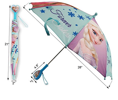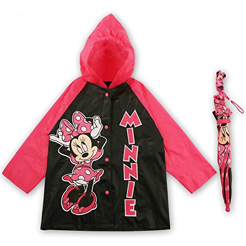 2-Piece matching rainwear set includes rain slicker and matching umbrella featuring the most popular Disney characters Elsa & Anna from Frozen, or Minnie Mouse from Disney Junior