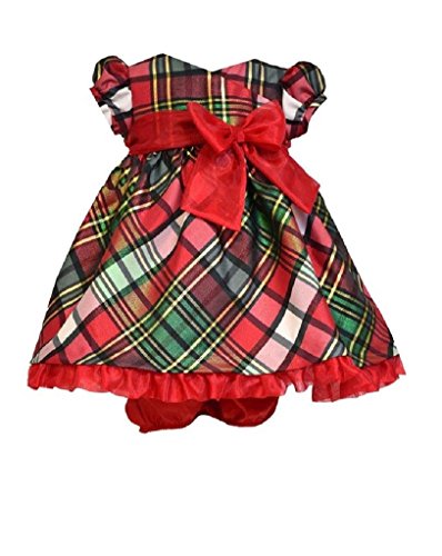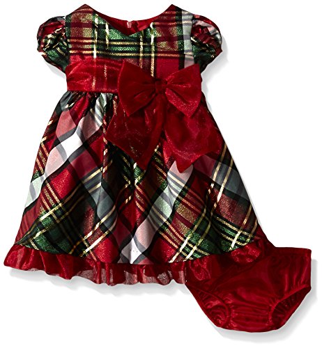 Taffeta plaid party dress with crossover bodice and sheer trim.