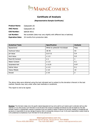 -. Feature : Stabilizing Oil-in-Water lsifier / Note: Item is Non-Returnable, Consists of Raw Materials / External Use Only, This is a Cosmetic Ingredient, Not a Finished Cosmetic Product / Description: Non-ionic polyoxyethylene ether of higher saturated fatty alcohols (cetyl/stearyl alcohol). White grains/pellets, no odor. Dissolves in water & alcohol to form a colloid solution. Can be mixed with mineral, vegetable or synthetic fats and oils. HLB value 16.27 (gives oil-in-water lsions). CAS: 68439-49-6. INCI Name: Ceteareth-25. Properties: Universal lsifier to make o/w lsions, compatible with all kinds of oils & active ingredients, very effective protective colloid that stabilizes all kinds of dispersed systems, can be combined with other lsifiers, optimal use with gel-forming thickeners. Compared to ceteareth-20, ceteareth-25 has a bit more gel-forming and thickening properties. Use: Typical use level 0.5-3% (up to 30% to make gel-like hydrates). For external use only. Applications: All kinds of lsion-based cosmetic products like creams, lotions (especially sprayable lotions), foundations, hair conditioners, sunscreen products.