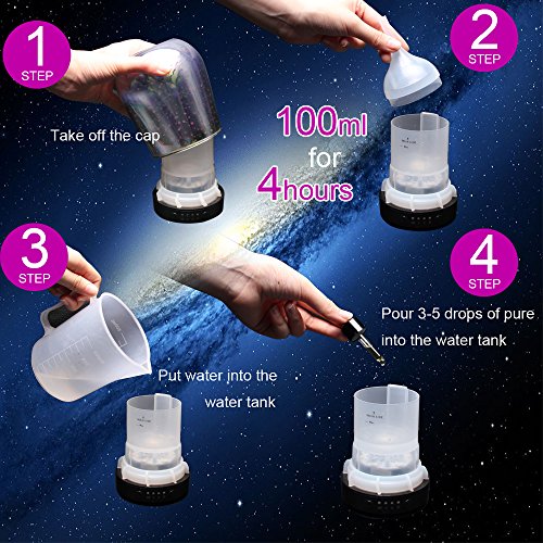 - 4 TIMER SETTINGS, LASTS ON 4 HOURS: You can set the timer by pressing the left button for 0.5,1,2 or 3hours.100ml essential oil diffuser lasts on 4 hours and has a good output of mist. Fits room not larger than 15*15(ft).