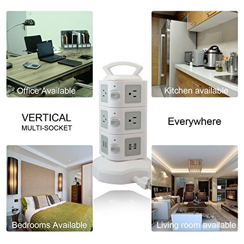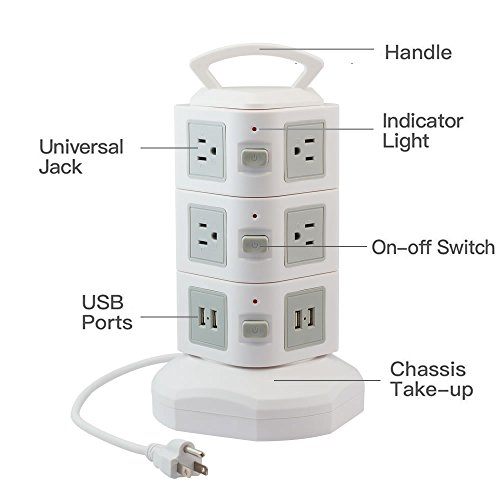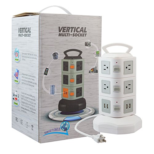 - MULTIPLE SOCKET & USB CONNECTOR - This vertical space outlets and ports are distributed vertically in the four sides of the power strip, providing enough space between each outlet that saves space and eliminate the risk of electric shock hazard. It has 10 outlets and 4 USB ports that have enough power plug and space for each outlet that can simultaneously charge your iPhone, iPad, Smart phones, tablets, laptops, digital cameras, lamp, PSP and other USB powered devices at home, office or travel.