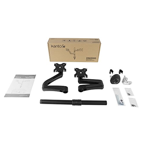 -. Binding : Office Product -. Brand : Kanto -. Color : Black -. EAN : 0800152715674 -. Feature : DUAL MONITOR MOUNT - The DM2000 desktop monitor mount supports two 13" to 27" monitors, with VESA sizes of 75x75 or 100x100. Its articulating arms provide up to 18" of reach and are height adjustable to allow the center of your screen to sit between 12" and 28.5" from the surface of your desk. / SWIVELS, ROTATES, AND TILTS - Fully adjustable and easy to position, the DM2000 allows you to tilt your screen up to 65° forward and 90° backward, while its articulating arms swivel 90° in either direction, depending on screen size. The mounting heads also allow you to rotate your screen 360° for horizontal and vertical display orientations. / QUALITY CONSTRUCTION - Made of durable aluminum with a powder-coated finish, the DM2000 can safely support monitors up to 19.8 pounds per arm. / CLEAN APPEARANCE - Push your screen back towards the wall to allow for more space on your desk. For an up-close view, extend the monitor arms up to 18″ towards you. This sleek computer mount also includes integrated cable management, keeping your desk space clean and tidy. / EASY INSTALLATION - The DM2000 comes with all the necessary mounting hardward. It's easy-to-use clamping mechanism allows it to be installed on any desk or table up to three inches thick. For a more discreet look, install it within a grommet hole. Phone support and an online video are also available to help you along the way. -. Label : Kanto Living -. Manufacturer : Kanto Living -. Model : DM2000 -. MPN : DM2000 -. NumberOfItems : 1 -. PackageQuantity : 1 -. PartNumber : DM2000 -. ProductGroup : Office Product -. ProductTypeName : OFFICE_PRODUCTS -. Publisher : Kanto Living -. Studio : Kanto Living -. Title : DM2000 Dual Monitor Desktop Mount – 13-inch to 27-inch Displays – Tilts, Swivels, and Rotates for Different Screen Orientations -. UPC : 800152715674