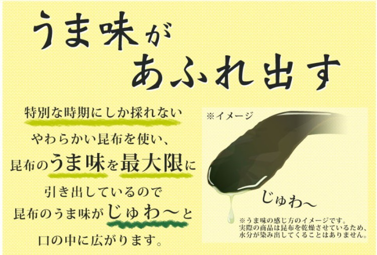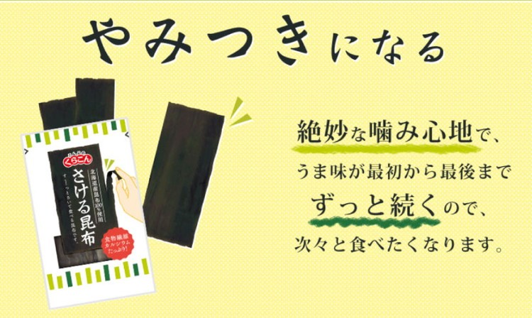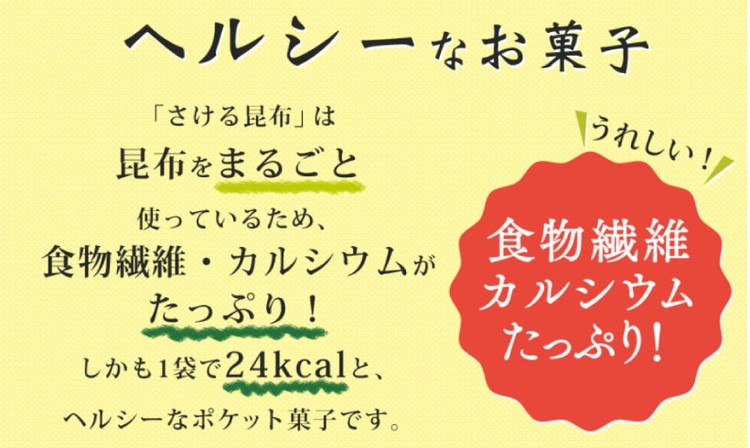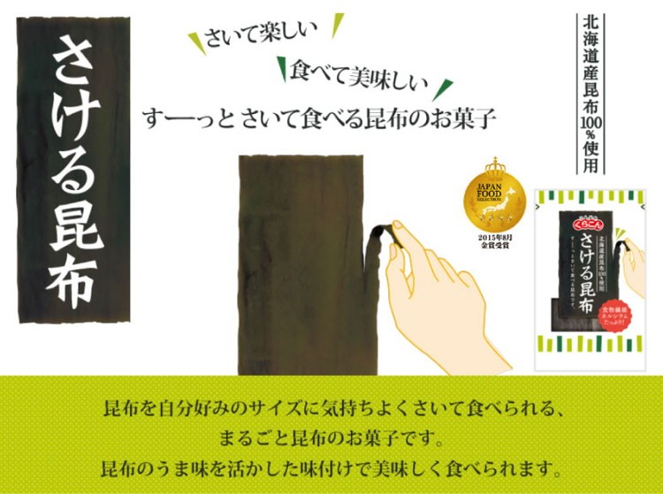 北海道産100%の昆布をまっすぐに気持ちよくさいて食べられるポケット菓子です。昆布をそのまま使っているため、食物繊維とカルシウムがたっぷりでうま味をいかした自然な味に仕上げています。食べて美味しい、さいて楽しい飽きのこないお菓子です。
