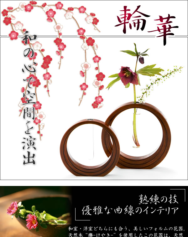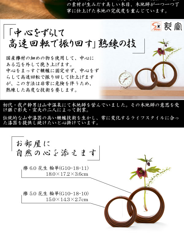 和室・洋室どちらにも合う、美しいフォルムの花器。天然木「欅-けやき-」を使用したこの花器は、天然の素材が生みだす美しい木目をそのまま生かした心和む優雅なデザインです。日本製 ※サプライヤー直送品 ご注文後、当日~1営業日後の出荷となります【商品名】欅 6.0 花生 輪華 G10-18-11