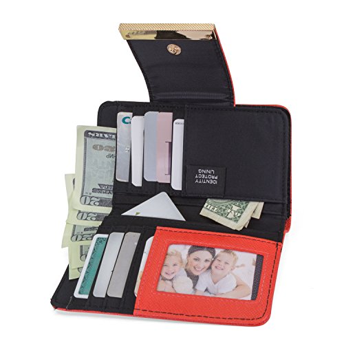 BEAUTIFUL AND FUNCTIONAL DESIGNED - This small but powerful wallet has 8 oversized card slots, 1 ID or picture windows, 4 larger pockets, 1 zippered pocket with two accordion pockets, a cash pocket and a snap button closure with gold hardware