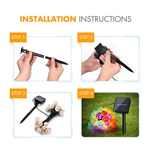 Cymas Waterproof Solar String Lights Create Warm, Joyful and Festive Ambience to Light up You Home, Garden, Patio, Lawn, Party and Holiday Product Specification Length: 21.3ft Length between 2 bulbs: 6.5 in LED Quantity: 20 LEDs LED Color: Multi-color (Yellow/Blue/Green/Red) Rechargeable Ni-MH Battery: 1.2V 600mA Working Time: Up to 8 hours after fully charging at daytime Lighting Mode: Combination, Waves, Sequential, Slo-Glo, ChasingFlash, Slow fade, TwinkleFlash, Steady on Tips 1. Make sure that the solar panel is not sheltered from the sun, because it needs to absorb enough energy from the sun. 2. The solar panel is charging only when the switch is turn ON. 3. The solar string lights are only designed to be protected from the rain. Please do not immerse it in the water. 4. Please note that the solar string light could not be extended or connected with other string lights. Package 1 x Outdoor Solar String Lights 1 x Solar Panel with Ground Stake 1 x User Manual Warranty The product includes a 45 days money back 18-month warranty. Any questions, please feel free to contact us. 0 |
