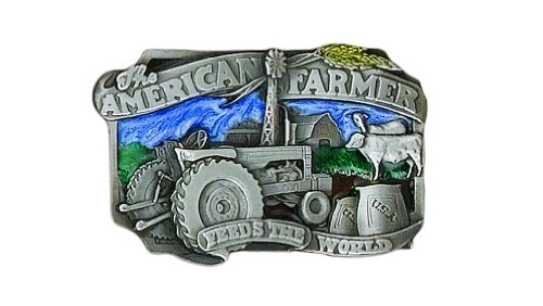 Binding : Apparel Product Description This belt buckle bears the words, "The American Farmer Feeds The World". It is detailed with images of a farm tractor, sacks of produce, cows and wheat grain on a farmyard setting. This belt buckle conveys American strength! 0