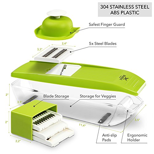 Mandoline Slicer - Vegetable Potato Slicer Grater - Cutter for Tomato, Onion, Cucumber, Zucchini Pasta, Cheese - Julienne Veggie Peeler Chopper - Vegetables Food Storage, 5 Blades and Hand Protector