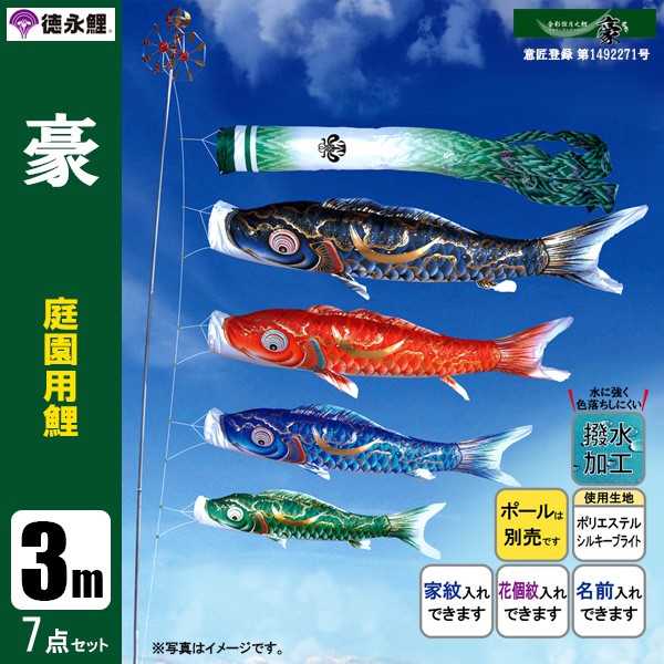 | 豪鯉 庭園用大型鯉のぼり スタンド砂袋式ポール付セット | 1.5m鯉3匹 | 2m鯉3匹 | 3m鯉3匹 3m鯉4匹 3m鯉5匹 | 4m鯉3匹 4m鯉4匹 4m鯉5匹 |