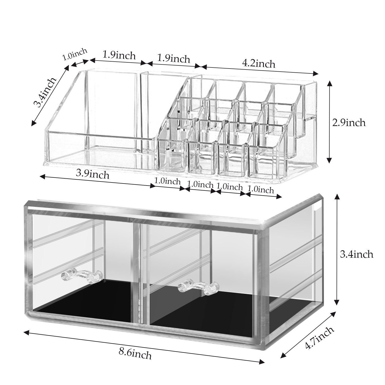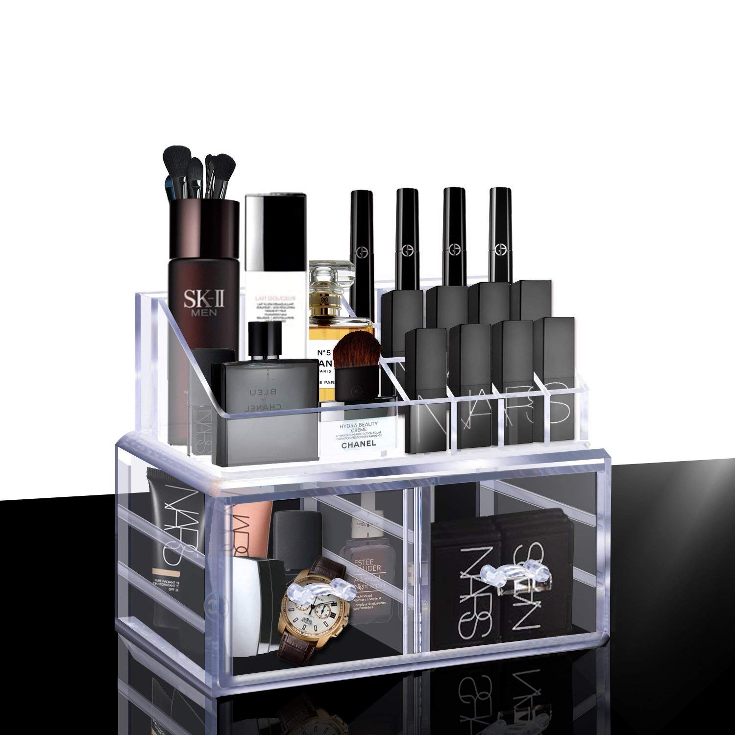 【自由に組み合わせる 超大容量収納 】口紅ホルダーと大容量の引き出しがあり、分けても重なっても使えます。大切な口紅を段差のある12格子に置け、3つの深い格子はマスカラやアイライナーなど長い物を収納できます。さらに、超大容量の引き出しが2つ付き、大物も小物も収納でき、一般的な引き出しと比べ、高いペトルや大きいペトルを入れないことがありません。