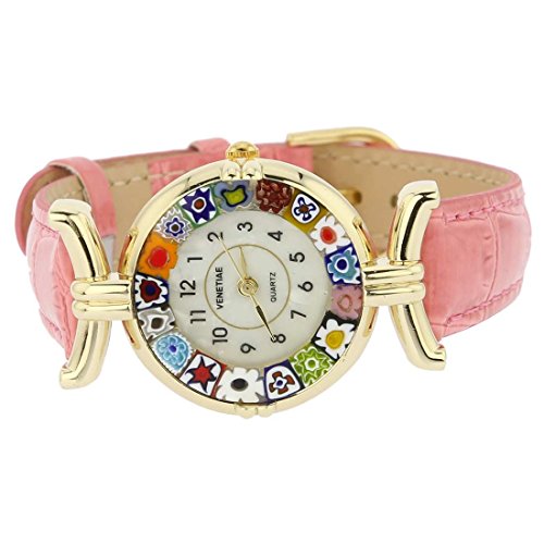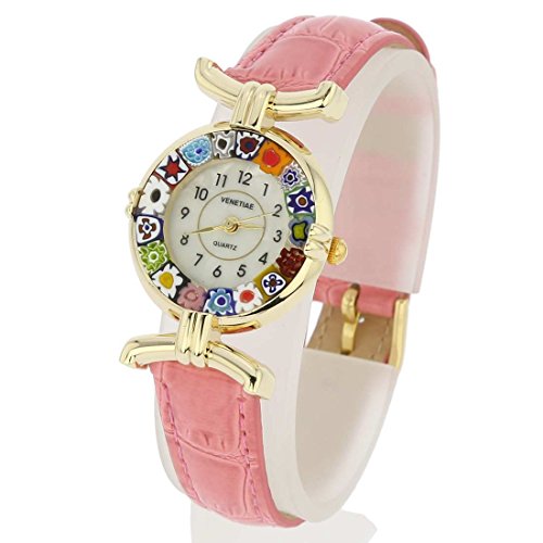 -. Title : Murano Glass Millefiori Watch with Leather Band - Pink