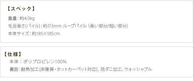 ※メーカー直送のため代金引換はお受けできません。※沖縄・一部離島は別途送料がかかります。お見積もりいたしますのでお問い合わせ下さい。【カラーバリエーション】グレー・ネイビー【仕様】本体:ポリプロピレン100%【サイズ】本体:約185x185cm毛足長さ(ループパイル):約7/3mm重量:約4kg株式会社ナカムラ(33100216)