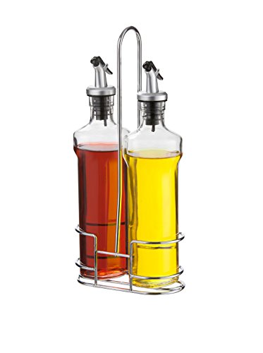 -. Feature : Clear glass construction with stainless steel and rubber / Clip spout lid / Includes 2 cruets and a wire caddy / Seals and pours / Long handle for easy carrying