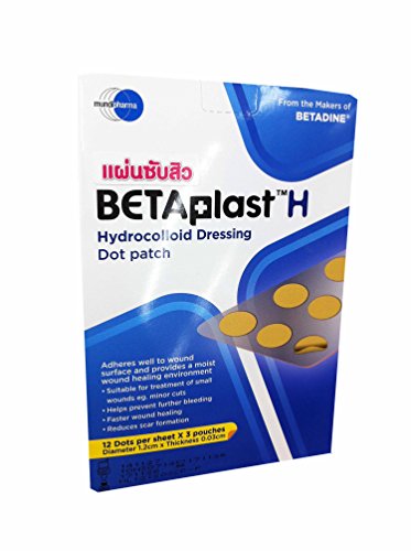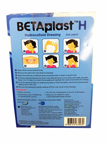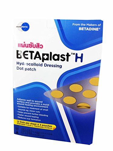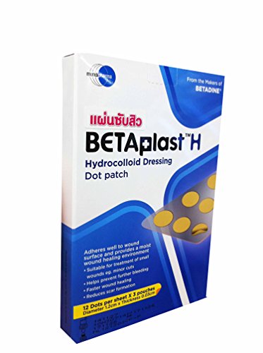 -. Binding : Misc. -. Brand : BetaplastH -. EAN : 0801779436034 -. Feature : Betaplast H, hydrocolloid dressing dot patch.(1 box:12 dots per sheet x 3 pouches, diameter 1.2 cm x thickness 0.03 cm) / Adheres well to wound surface and provides a moist wound healing environment. / suitable for treatment of small wounds eg. minor cuts. helps prevent futher bleeding. faster wound healing. reduces scar formation. / free!! Tracking number and sticker Thai_product, souvenir from Thai_product., High Quality & Services by Thai_product. / 1.clean minor wound and let it dry. 2.remove dot patch from the sheet as required. 3.apply the dressing on affected area and gently press it down to secure well. 4.once the dressing absorbs the fluid in the affected area, it turns white and swells upwards. keep it for 2-3 days to contain the exudate and maintain the moist environment for healing. 5.once the dressing does not swell up anymore or if the fluid leaks, remove the dressing and replace with a new one. 6.remove the dressing by gently peeling off one corner of the dressing. -. Label : Thailand -. Manufacturer : Thailand -. ProductGroup : Beauty -. ProductTypeName : BEAUTY -. Publisher : Thailand -. Studio : Thailand -. Title : Betaplast H, Hydrocolloid Dressing Dot Patch.(1 Box:12 Dots Per Sheet X 3 Pouches, Diameter 1.2 Cm X Thickness 0.03 Cm) -. UPC : 801779436034