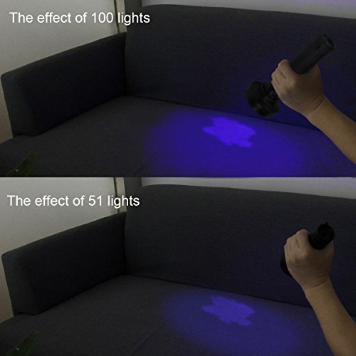 DETECT LARGER AREA WITH BRIGHTER LIGHT - This UV Light has 100 UV LEDs which is much Brighter than 51 led uv lights. It Also covers larger area without weaken the light. UV sight Will pinpoint the areas with ease, no need to steam clean the entire carpet or crawl around sniffing the floor any longer.