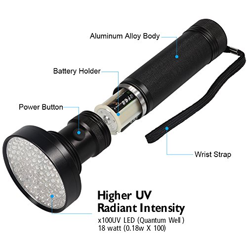 QUALITY ASSURANCE - Emits 395nm wavelength with 100 top quality ultraviolet led lights, each LED lasts up to 12 years. Very strong and lightweight, impact resistant military grade aluminum weighing.