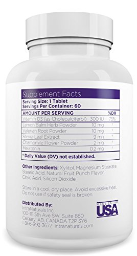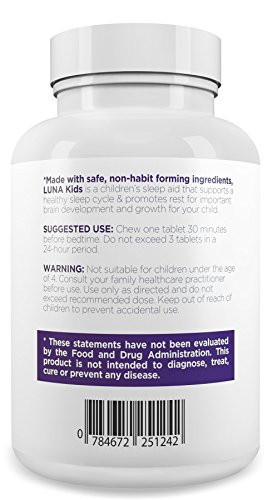 -. Binding : Health and Beauty -. Brand : IntraNaturals -. EAN : 0784672251242 -. Feature : Made with herbal, gentle, and safe ingredients - LUNA Kids is made with safe, natural ingredients that don't have any of the harsh side effects and concerns of drug store brands. It contains natural herbs like Valerian to relax the central nervous system, Chamomile to calm and soothe before bed, as well as Melatonin to ease your child into a relaxed state and induce deep, restful sleep. / Eases your child to sleep - Due to the unique blend of natural and herbal ingredients, LUNA Kids is designed to be as mild as possible, while still being effective. It doesn't have the harsh effect of "knocking you out" like artificial drug store brands which can be damaging to a growing child. Our promise behind LUNA Kids has always been "Natural, Gentle, and Effective". / Promotes a healthy sleep cycle - For optimal health, your child needs lots of consistent, high quality, and undisturbed sleep every night. Since the majority of brain development happens at night time, it's absolutely crucial for your child to have plenty of deep & R.E.M. sleep to allow for important brain functions. LUNA Kids helps to regulate sleeping patterns in your child to ensure they get the sleep needed to develop to their full potential. / Make bedtime delicious - Your child will love the delicious Tropical Berry flavor of LUNA Kids, making it as easy as possible for you to get them to bed. Plus, each tablet is chewable and dissolves on your child's tongue in seconds so you never have to deal with hard to swallow capsules or tablets again. / Protected by the IntraNaturals Lifetime Guarantee - All IntraNaturals products come with our Lifetime Guarantee. If at any point in the future you're not happy with your order, let our friendly Customer Care Team know and we'll refund your entire purchase - 100% Guaranteed. -. IsAdultProduct : 0 -. Label : IntraNaturals -. LegalDisclaimer : These statements have not been evaluated by the Food and Drug Administration. This product is not intended to treat, diagnose, cure, or prevent any disease. -. Manufacturer : IntraNaturals -. MPN : 0784672251242 -. PackageQuantity : 1 -. PartNumber : 0784672251242 -. ProductGroup : Health and Beauty -. ProductTypeName : HEALTH_PERSONAL_CARE -. Publisher : IntraNaturals -. Size : 60 -. Studio : IntraNaturals -. Title : LUNA Kids (60 Tabs) - #1 Natural Sleep Aid for Children 4+ and Sensitive Adults - Herbal, Gentle & Safe Sleeping Pill (Made with Melatonin, Valerian, Chamomile, Lemon Balm & More) - Lifetime Guarantee -. UPC : 784672251242