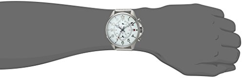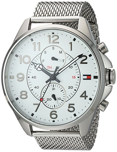 Gents Tommy Hilfiger watch collection. Stainless steel case. Stainless steel mesh band. White dial. Multi function dial. Case size: 46 mm. Scratch resistant mineral crystal. Water resistant: 50 meters 165 feet. Movement: Quartz. Comes with original box and booklet. Warranty: 10 Years.