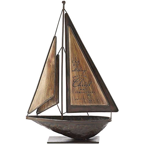 All Things Through Christ Woodgrain 12 x 8.5 Metal and Resin Stone Table Top Sailboat Figurine