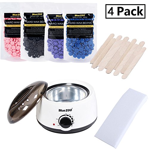 BlueZOO Hair Removal Waxing Kit-Electric Wax Warmer with 4 Pack of Brazilian Depilatory Hard Wax Beans and 10PCS Applicator Sticks for Legs,Body,Bikini Hair Removal