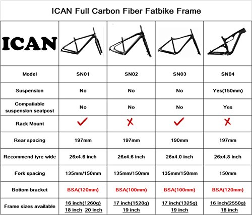 Studio : ICAN Publisher : ICAN Product Description All of ICAN frame and wheelset will have 730 days warranty Material: Full Carbon Fiber T700 Weave: UD Matt Wheel Size : 26er Available Sizes: 16/18/20 inch BB Type : BSA (120MM BB SHELLS) Brake Type: Disc Brakes - hydraulic pressure Rear axle Spacing: 197 Seat post Size : 31.6mm Seat clamp Size : 34.9mm Headset:1-1/8' 1-1/2' Frame Weight: 1260 -20g-16inch; 1280 -20g-18inch; 1330 -20g-20inch Recommend Tire Wide 4.0 inch 18/20 Inch Max Tire 26erx4.8 inch 16 Inch Max Tire 26erx4.7 inch Geometry Size 16inch(you can see other size geometry on the photo) Top Tube (effective) 580mm Seat Tube (BB Center to Top) 483mm Chain Stay (actual) 445mm Seat Tube Angle 73.5° Bottom Bracket Drop 60mm Head Tube Length 100mm Head Tube Angle 68.5° Fork offset 45mm Wheelbase 1102.9mm We have 29er and 29 wheelset which will fit this 26er carbon frame. pls contact us if you are interested in it. 0