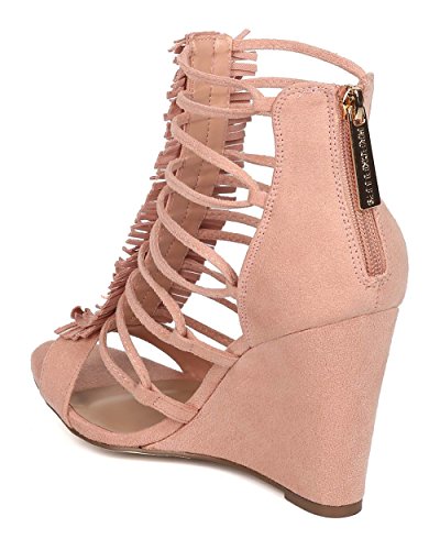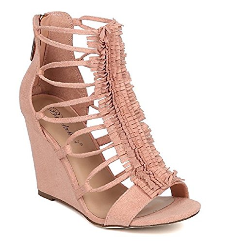 Product Description These faux suede sandals are made with a peep toe, caged construction and fringed details at vamp. Also made with a single sole, wedge heel and hind zip for easy slip on and off. 0