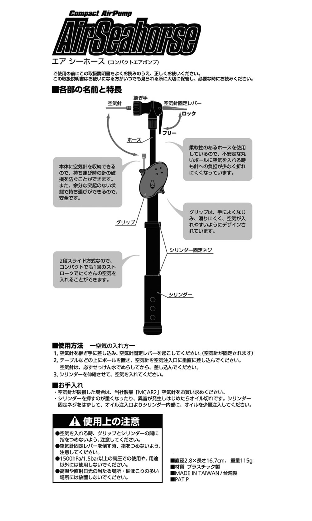 molten (Molten) HPAS Air Sea Hose Air Pocket Specification / Plastic Size / Diameter 2.8 x Length 16.7 cm Weight / 115 g ● With Air Needle ● Because hose and needle can be stored in the main body, it is bulky.