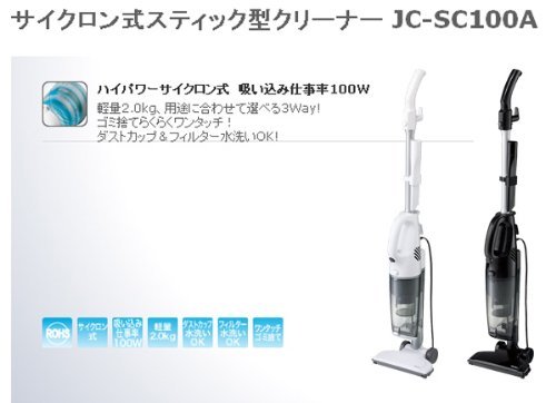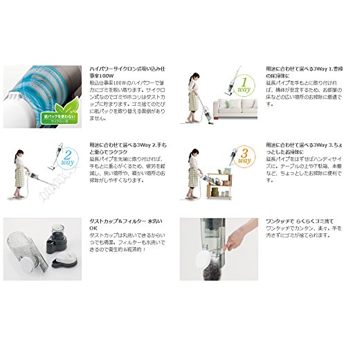◆ハイパワーサイクロン式 吸い込み仕事率100W吸込仕事率100Wのハイパワーで強力にゴミを吸い取ります。サイクロン式なのでゴミやホコリはダストカップに貯まります。ゴミ捨てのたびに紙パックを取り替える面倒がありません。◆軽量2.0kg、用途に合わせて選べる3Way・普段の床掃除に延長パイプを手もとに取り付ければ、機体が安定するため、お部屋の床などの広い場所のお掃除に最適です。・手もと重心でラクラク延長パイプを先端に取り付ければ、手もとに重心がくるため、疲労を軽減し、狭い場所や、細かい場所のお掃除がしやすくなります。・ちょっとしたお掃除に延長パイプをはずせばハンディサイズに。テーブルの上や下駄箱、本棚など、ちょっとしたお掃除に便利です。◆ゴミ捨てらくらくワンタッチワンタッチでカンタン、楽々。手を汚さずにゴミが捨てられます。◆ダストカップ&フィルター 水洗いOKダストカップは丸洗いできるからいつでも清潔。フィルターも水洗いできるので衛生的&経済的! / ■ 仕 様 ■集塵方式:サイクロン式 ノズルタイプ:フロアブラシ 吸込仕事率:100W 消費電力:450W 本体寸法(約):幅227×奥行197×高さ1030mm 本体質量(約):2.0kg 運転音:73dB 集塵容積(約):0.9L 電源コード長さ(約):5.0m 付属品:すき間ノズル、すき間ノズル用ホルダー、ハンドル、延長パイプ /Feature