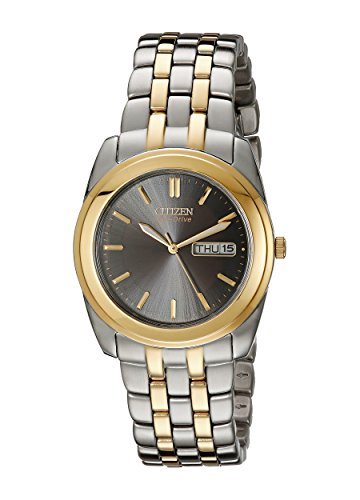 Two-tone stainless steel bracelet watch with silver-tone dial featuring stick hour markers and day and date display at three o''clock 35 mm stainless steel case with mineral dial window Japanese quartz movement with display Two-tone-stainless steel band with fold-over clasp with double push-button safety Water resistant to 30 m (99 ft): In general, withstands splashes or brief immersion in water, but not suitable for swimming