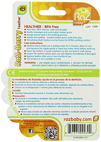 RaZbaby RaZ-Berry teether is a stimulating, multi-textured pacifier used to soothe baby’s gums. This hands-free all silicone teething pacifier can also be frozen for extra comfort. RaZ-Berry is non-toxic, 100% medical grade silicone and BPA-free.